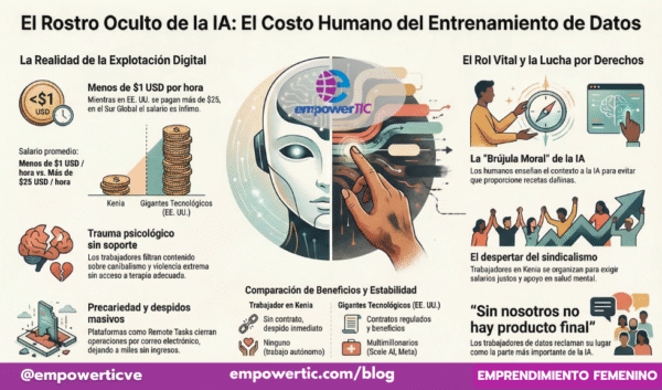La cara invisible de la Inteligencia Artificial es un tema que en EmpowerTIC si estamos dispuestos a conversar. Desde nuestros inicios hemos insistido en que la inteligencia artificial no es solo una revolución tecnológica; es también un fenómeno social, político y profundamente humano. Cada vez que utilizamos un chatbot, generamos imágenes con IA o recibimos recomendaciones automáticas en una plataforma digital, solemos pensar que estamos frente a un sistema autónomo capaz de aprender por sí mismo. Estos temas pueden resultar incómodos y algo increíbles, por eso nuestra misión es clara: Fortalecer competencias digitales a lo largo de la vida